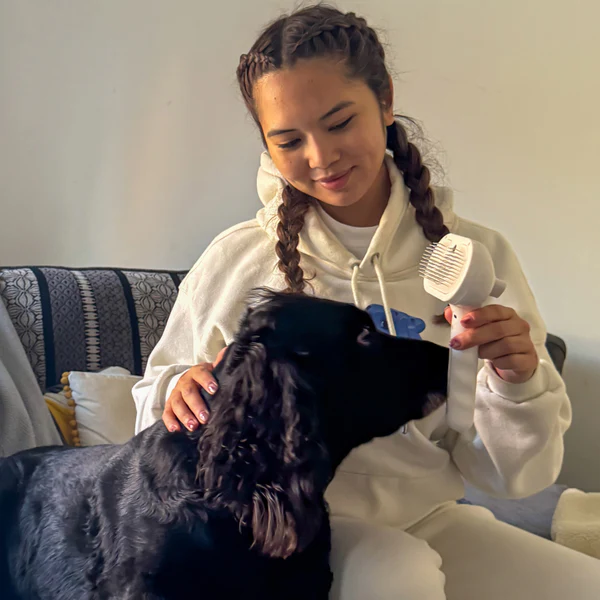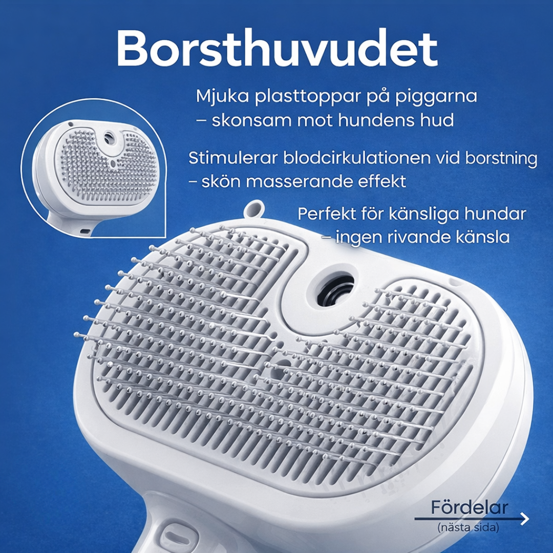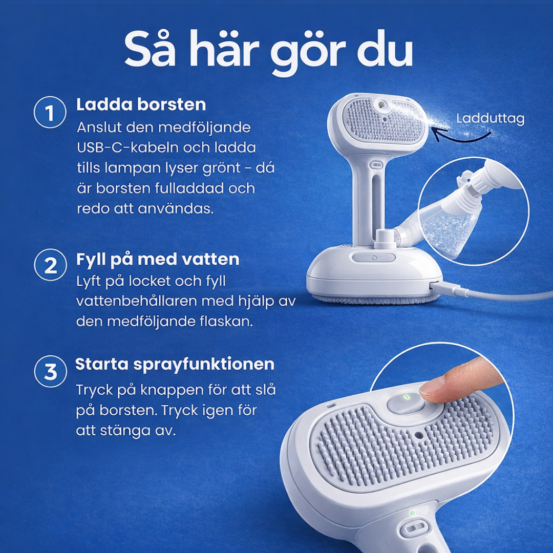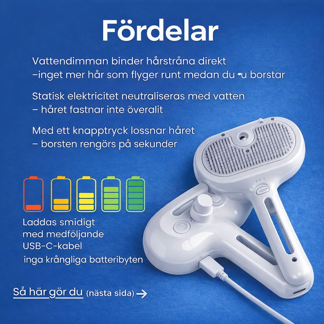 PälsBorsten™ använder en fin vattendimma som lätt fuktar pälsen och minskar statisk elektricitet. Det gör att lös päls och smuts lossnar och samlas direkt i borsten istället för att spridas i hemmet.